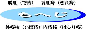 脱肛(で痔)、裂肛痔(きれ痔)、外痔核(いぼ痔)、内痔核(はしり痔